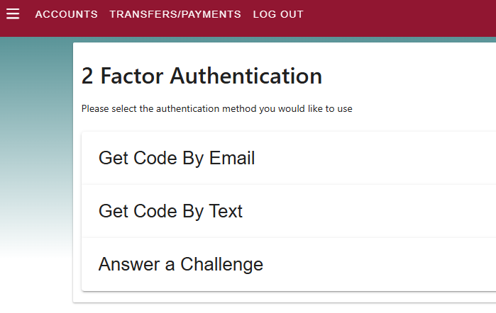 After selecting Transfers/Payments, you may be asked to complete Two-Factor Authentication for security.