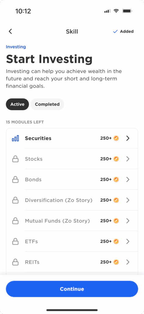 Zogo is a gamified financial education app that rewards users for completing bite-sized educational modules. When correctly answering questions following each module, learners earn points in the form of Pineapples which can be exchanged for gift cards to popular retailers.